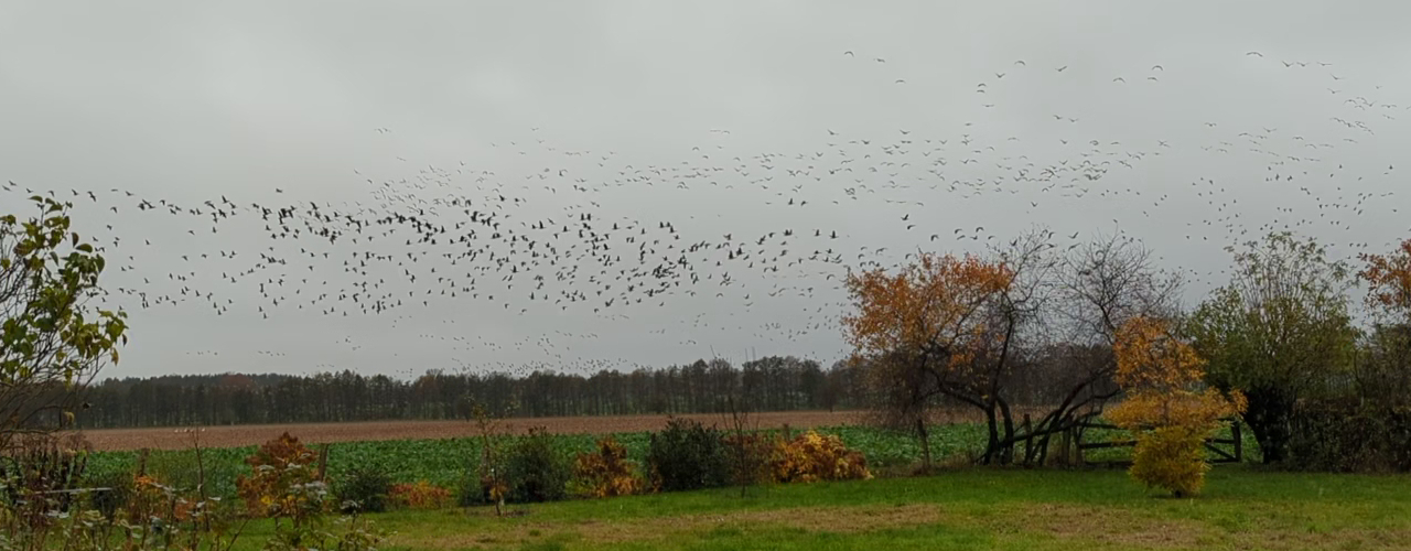 Blick von unserer Hofstelle auf das umgebende Feld, wo sich im Herbst regelmäßig Zugvögel sammeln. Meist sind es Kraniche und Wildgänse wie hier in den Aufnahmen vom 13.-16.11.2023. Die Vögel sammeln sich großflächig auf den Acker und Wiesenflächen des Areals, einschließlich des unmittelbaren Teils, der mit Windrädern bebaut werden soll. Sie sammeln sich über mehrere Tage und fliegen häufig auf und umher, bevor sie die Gegend verlassen.