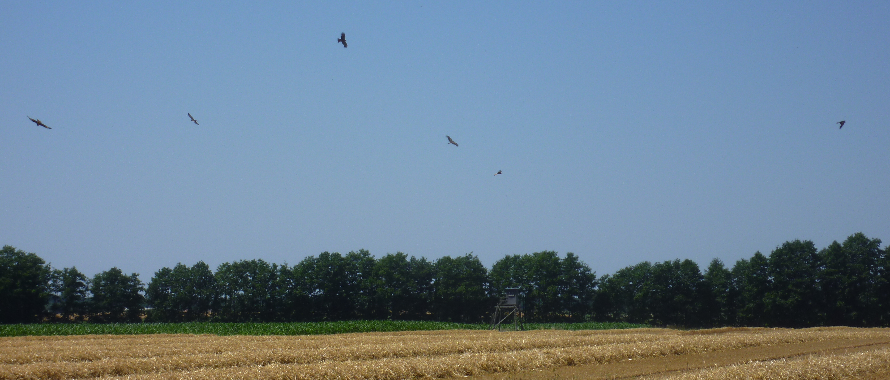 Blick von unserer Hofstelle auf das umgebende Feld während der Getreideernte. Wir sehen Fischadler, Rotmilane und weitere Arten, die wir selbst nicht identifizieren können, auf Beutefang. Aufnahmedatum ist der 8.7.2023.
