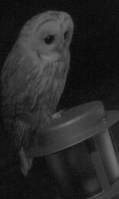 Manchmal sind zwei Exemplare gleichzeitig auf einer Aufnahme zu sehen. Die Eulen kommen zu jeder Jahreszeit gelegentlich und sind dann jeweils einige Nächte hintereinander hier aktiv.